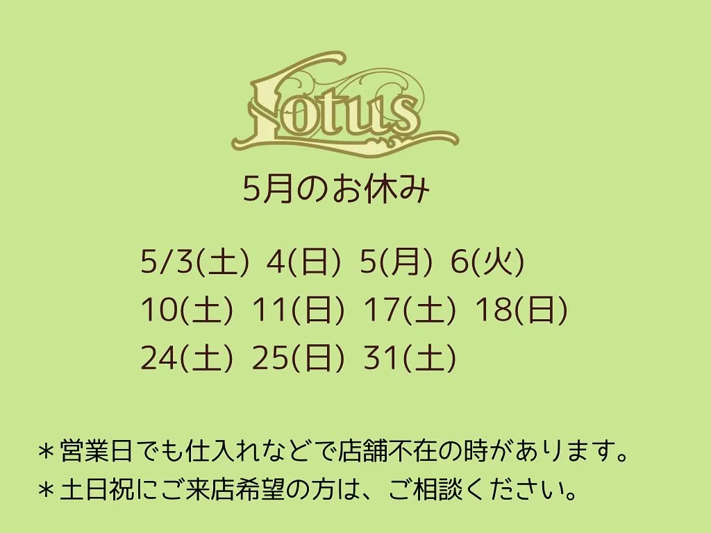 5月のお休み 2025/04/27 5月のお休み 5/3(土) 4(日) 5(月) 6(火) 10(土) 11(日) 17(土) 18(日) 24(土) 25(日) 31(土) *営業日でも仕入れなどで店舗不在の時があります。 *土日祝にご来店希望の方は、ご相談ください。