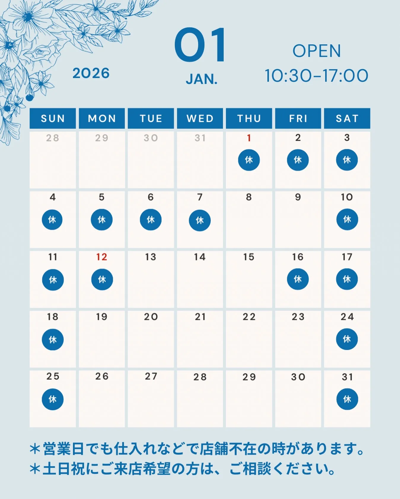 1月のお休み 2026/01/02 1月のお休み 1/1〜7 1/10.11.12.16.17.18.24.25.31 *営業日 平日10:30〜17:00 *営業日でも仕入れなどで店舗不在の時があります。 *土日祝にご来店希望の方は、ご相談ください。