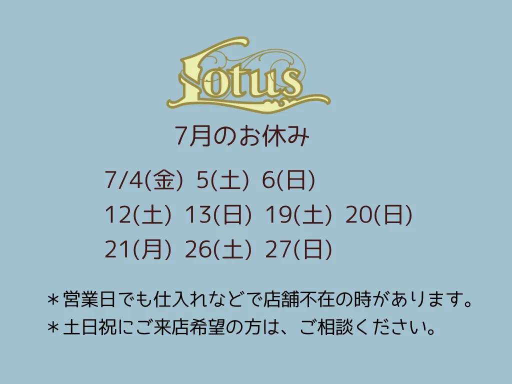 7月のお休み 2025/07/01 7月のお休み 7/4(金) 5(土) 6(日) 12(土) 13(日) 19(土) 20(日) 21(月) 26(土) 27(日) *営業日でも仕入れなどで店舗不在の時があります。 *土日祝にご来店希望の方は、ご相談ください。 新着情報