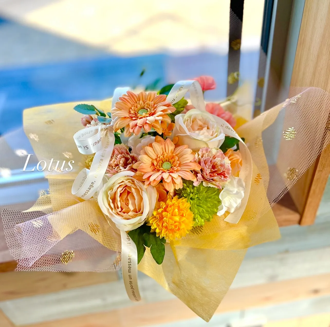 オーダーメイドアレンジオレンジ系のビタミンカラー♡ガーベラ、バラ、カーネーション、マム、アジサイ、スイトピー(全てアーティフィシャルフラワー)#つくば造花#つくば花屋#つくばアーティフィシャル…