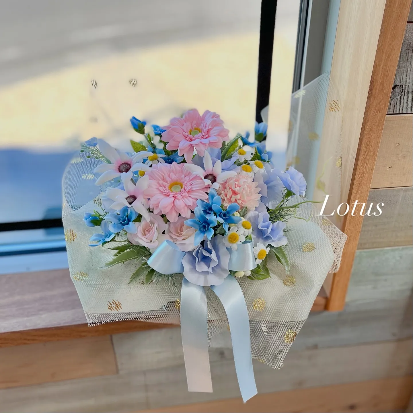 可愛いピンクと空色のアレンジ♡ギフトフラワーオーダーメイドガーベラ、バラ、ブルースター、フランネルフラワー、マトリカリア、、マム、アジサイ、スイトピー(全てアーティフィシャルフラワー)#つく…